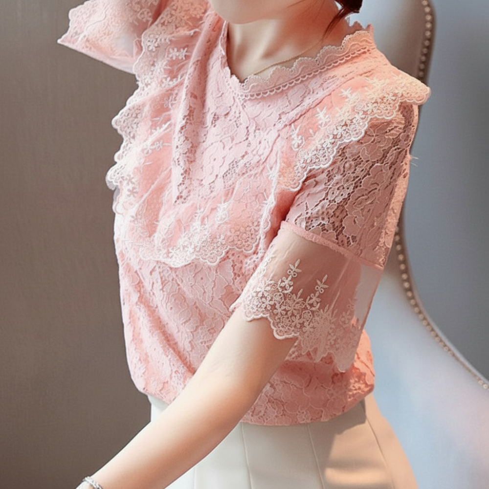 Această bluză delicată din dantelă adaugă o notă feminină și romantică oricărei ținute. Cu modele florale fine, oferă eleganță și textură look-ului tău. Țesătura ușoară asigură confort fără a compromite rafinamentul. Perfectă atât pentru ocazii speciale, cât și pentru purtarea zilnică. O piesă versatilă care se potrivește de minune cu fuste sau pantaloni.