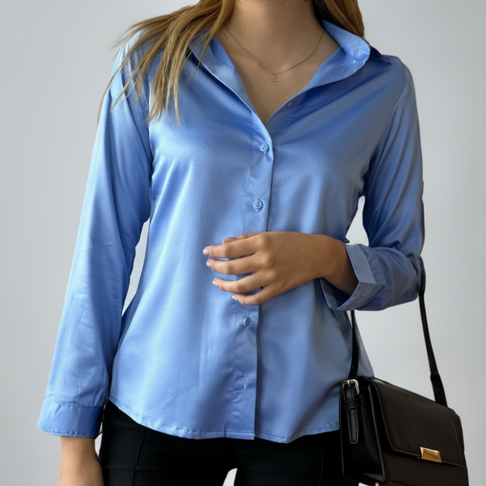 Această bluză are un finisaj satinat elegant care oferă un aspect rafinat. Designul clasic cu nasturi o face ușor de asortat atât pentru birou, cât și pentru ieșiri casual. Cu mâneci lungi și un guler structurat, adaugă eleganță oricărei ținute. Țesătura moale și ușoară asigură confort pe tot parcursul zilei. Un element de bază versatil pentru orice garderobă.